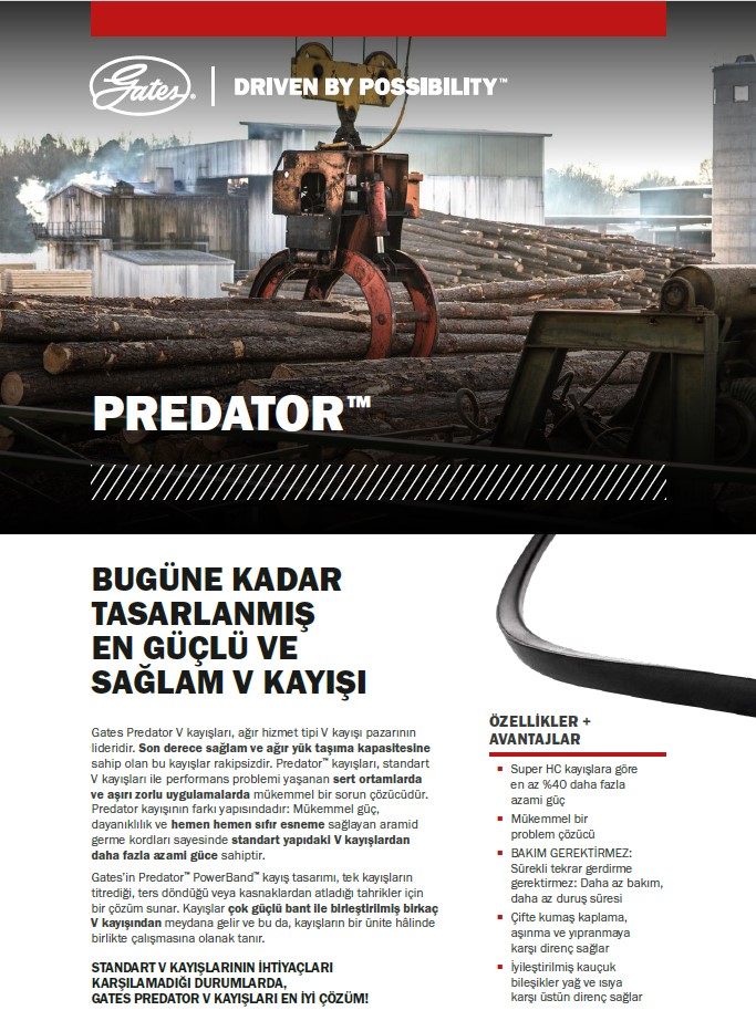 Predator® kayışları, madencilik, tarım, ahşap işleme, petrol sahası ekipmanları, inşaat ve kum/çakıl operasyonları gibi titreşimli yüklere veya ağır darbeli yüklere maruz kalan ağır hizmet uygulamaları için OE kalitesinde yedek kayışlar olarak tasarlanmıştır.